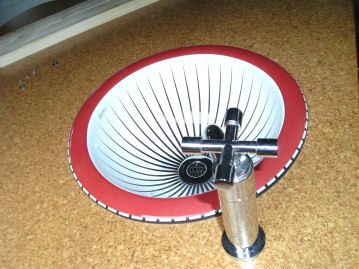 Im Schrank unter der Tischplatte steht ein 50 l Wassertank mit 12 Volt Tauchpumpe. Der Wasserhahn bleibt immer geöffnet, beim Einschalten der Pumpe (Kippschalter am Tisch) läuft Wasser. Einfach und effektiv. Abfluss durch den Boden nach draußen. Natürlich kann man einen Eimer drunterstellen.