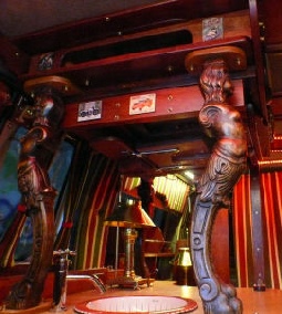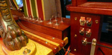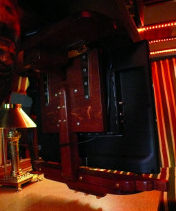 Auf dem Foto rechts sieht man oben in der Konsole das Fach fürs Notebook. Der Flachbildschirm ist hochgeklappt.