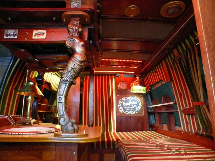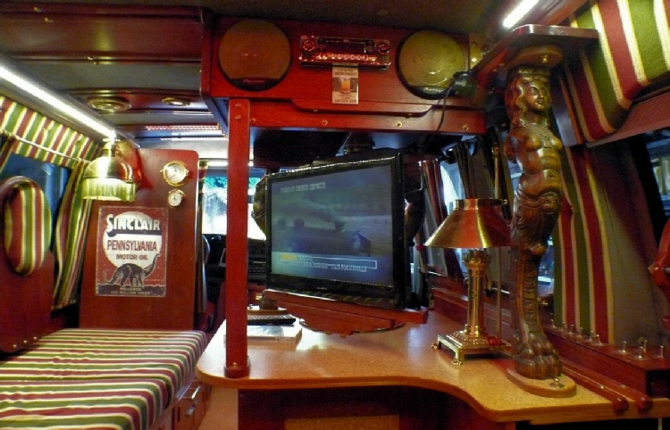 Die Konsole über dem Tisch beherbergt ein Bordradio, 4 Lautsprecher, ein Fach für